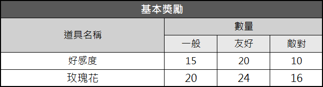 ※依據隊長為[一般]、[友好]或[敵對]關係,將給與不同數量的玫瑰花和好感度。